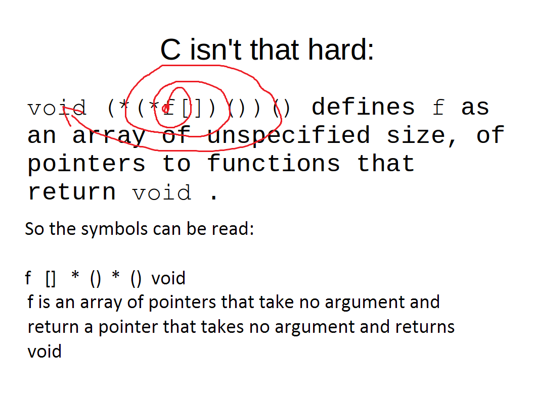 简单来说: f是一个函数指针数组,数组中的每一个元素都是指针指向某个函数,这些函数又返回一个函数指针,其返回 void类型的函数